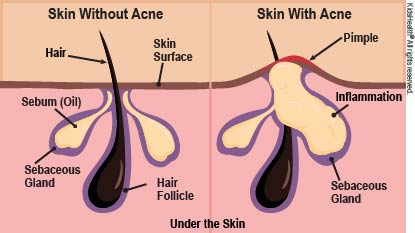 Pores become clogged if there is too much sebum and too many dead skin cells. Bacteria (especially one called Propionibacterium acnes) can then get trapped inside the pores and multiply. This causes swelling and redness — the start of acne: