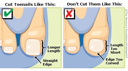 To avoid ingrown toenails, cut toenails straight across and long enough so the corners are not tucked down into the skin. Don’t rip or tear toenails. Being careful when trimming your toenails can help avoid problems with ingrown nails later.