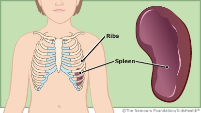 The spleen is located in the upper left part of the belly under the ribcage. It helps protect the body by clearing worn-out red blood cells and other foreign bodies (such as germs) from the bloodstream.