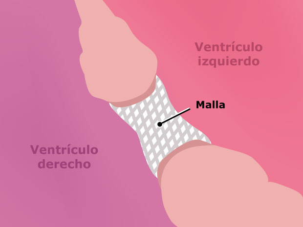 En contadas ocasiones, los cardiólogos recurren a un cateterismo cardíaco para cerrar algunos tipos de comunicación interventricular. Insertan un tubo delgado y flexible (un catéter) en un vaso sanguíneo de la pierna del niño que lleva al corazón. Y luego guían el tubo hasta el interior del corazón para hacer mediciones de flujo sanguíneo, presión y concentración de oxígeno en las cavidades cardíacas. Se coloca un implante especial (dos discos de malla metálica flexible) dentro del orificio del tabique. Este dispositivo está pensado para que se aplane contra el tabique a ambos lados y selle de forma permanente la comunicación interventricular.
