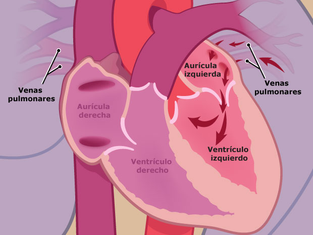 - Cuando late su corazón, parte de la sangre del ventrículo izquierdo (que ha sido enriquecida con el oxígeno procedente de los pulmones) fluye hacia el ventrículo derecho a través del orificio del tabique.
