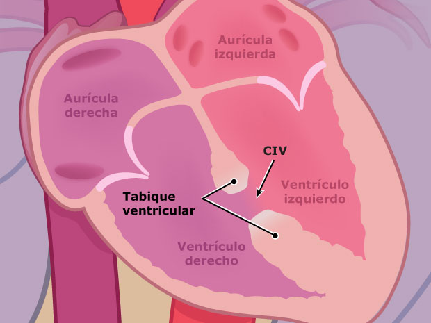 El ventrículo izquierdo y el ventrículo derecho del corazón están separados por una pared compartida, llamada tabique. Los niños con una comunicación interventricular tienen un pequeño orificio en ese tabique. Por lo tanto: